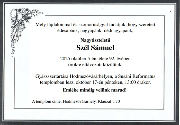 Szél Sámuel életének 92. évében, 2025. október 5-én adta vissza lelkét a Teremtőnek. Hűséggel szolgált 44 éven át: Derecskén 1960-1969 között segédlelkész, Konyáron 1969-1983 között, Földesen pedig 1983-tól 2004-ig volt megválasztott lelkipásztor.