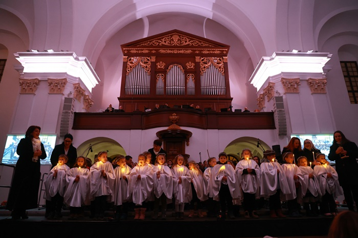 A Debreceni Református Kollégium Óvodájának adventi műsorával kezdődött a program (felkészítő tanár: Bródi Gáborné Mónika), majd az Egyesített Kórus, a Maróthi György Kamarazenekar, a Kharisz Rézfúvós Együttes és a Lituus Rézfúvós Együttes tagjai léptek a színpadra, akik a Halld, mint zeng az egész ég című karácsonyi énekfeldolgozást adták elő Tóth Donát vezényletével. Nemcsak az egyházkerület fenntartásában működő óvoda, hanem az egyik általános iskola, a Kölcsey Ferenc Református Gyakorló Általános Iskola is bemutatkozott: a Vox Iuventutis Gyermekkar Kissné Szemző Eszter vezetésével John Rutter Mary’s lullabay című énekét adta elő, majd maradva a színpadon, az iskola pedagógusa, Vad Péter Zsigmond: Ó, kicsinyke Betlehem, majd Örvendj, világ című darabját adták elő a Kölcsey Ferenc Református Gyakorló Általános Iskola Kicsinyek Kórusával.