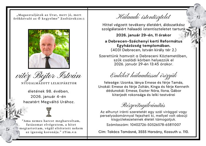 FőoldalKerületiElhunyt vitéz Bojtor István Elhunyt vitéz Bojtor István A nyugalmazott lelkipásztor élete utolsó éveit Hajdúszoboszlón töltötte.