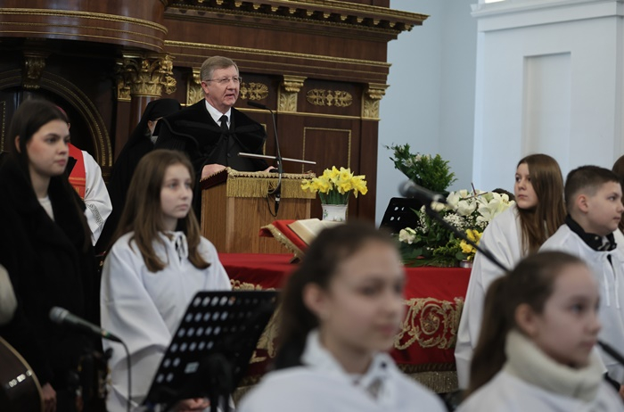 Fekete Károly, a Tiszántúli Református Egyházkerület püspöke a templomban jelen lévő gyermekek láttán azzal kezdte beszédét, hogy amikor az első virágvasárnapon Jézus Jerikó felől bevonult Jeruzsálembe, hasonló jelenet fogadhatta őt is. Hasonló ahhoz, amit ma is láthatunk: gyermekek és felnőttek együtt érkeznek, és egy szívvel, egy lélekkel kiáltják: