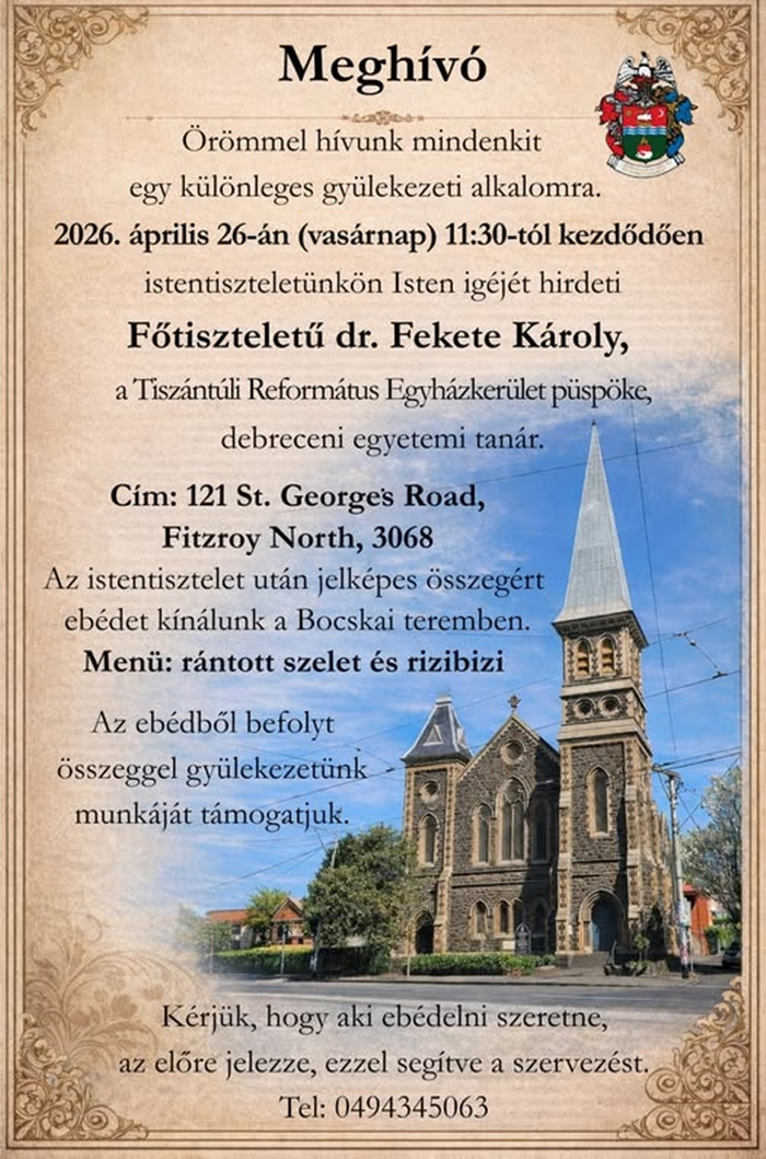 Fekete Károly püspök 2026. május 3-án a Sydney-i Református Gyülekezetben hirdeti majd Isten igéjét.