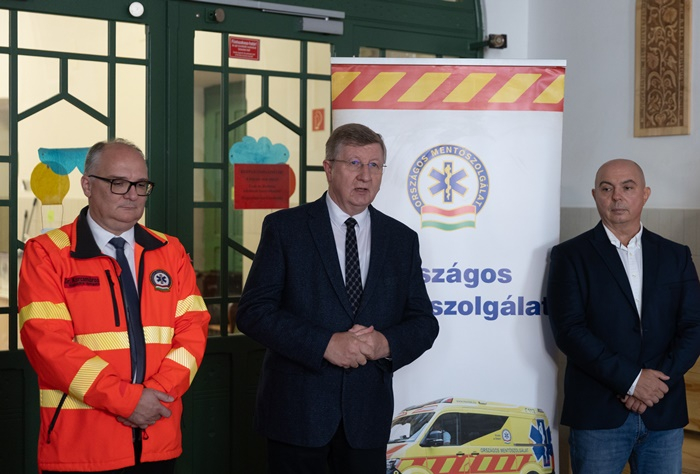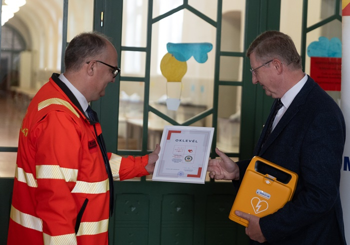 Az Országos Mentőszolgálat képviseletében Dr. Korcsmáros Ferenc regionális igazgató arról beszélt, hogy a társadalmi felelősségvállalás legszebb példája, hogy az iskolák több pedagógusa is vállalta a defibrillátor használatához szükséges képzés elvégzését. Kiemelte, hogy percenként tíz százalékkal csökken az újraélesztés sikerességének esélye, így az OMSZ nagy hangsúlyt fektet az azonnali beavatkozás támogatására. Ezért indították el az Élet Mentő Pont kezdeményezést, amelynek lényege, hogy ha egy intézmény, cég, vagy bármilyen szervezet félautomata defibrillátort szerez be, akkor a mentőszolgálat térítésmentesen, a helyszínen adja át a szükséges tudást az elméleti és gyakorlati képzés során. Miután ezek a feltételek a Debreceni Református Kollégium Általános Iskolája és a Debreceni Református Kollégium Gimnáziuma és Diákotthona esetében teljesültek, a két intézmény átvehette az erről szóló tanúsítványt.