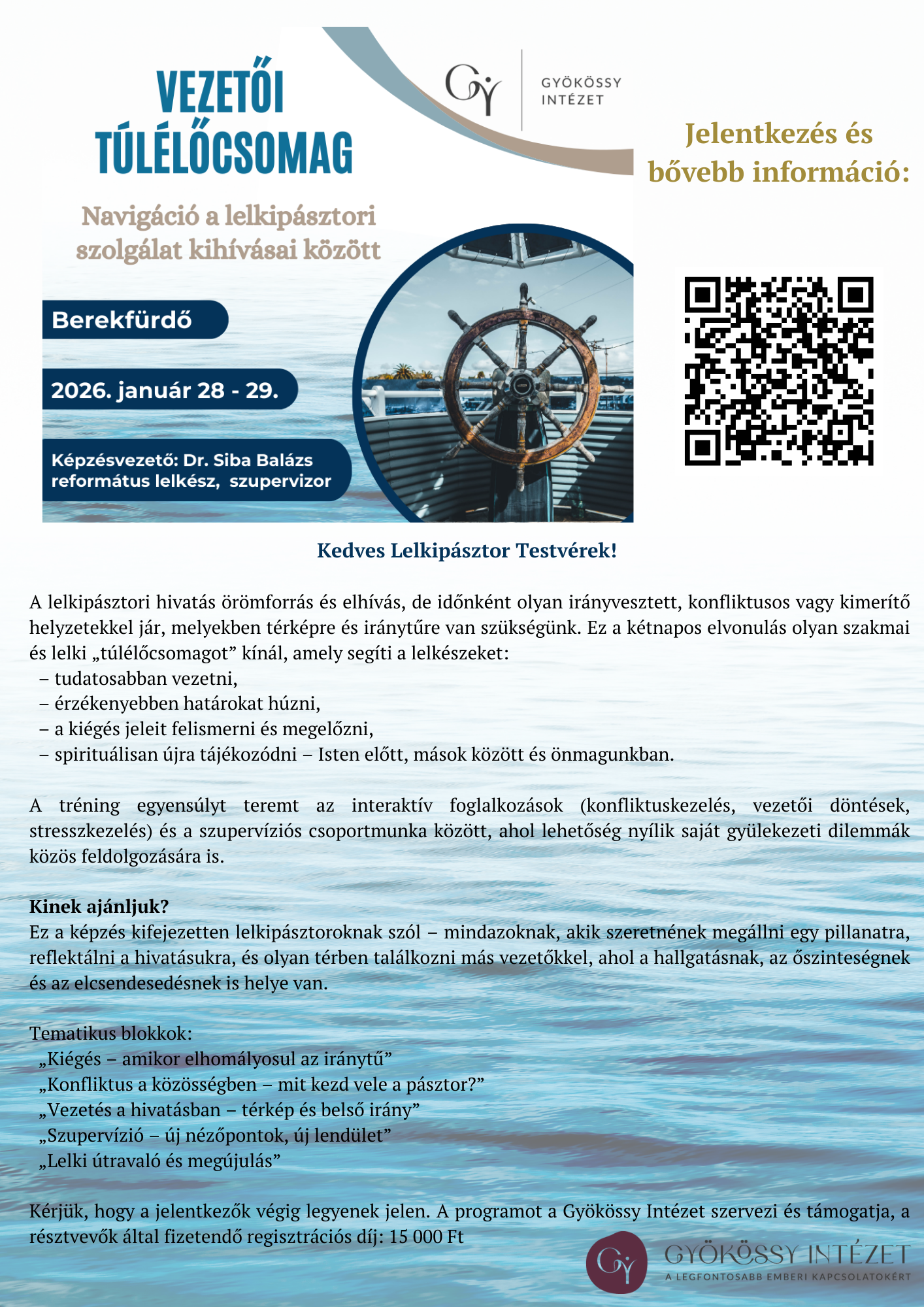 2026. január 28–29-én Berekfürdőn rendezik meg a „Utaidat, Uram, ismertesd meg velem” elnevezésű lelkipásztori tréninget, amelyet Dr. Siba Balázs református lelkész, egyetemi oktató és szupervizor vezet. A kétnapos program a lelkipásztori szolgálat kihívásaira kínál útmutatást és „túlélőcsomagot”: a résztvevők önismereti és vezetési gyakorlatok, valamint szupervíziós beszélgetések révén fedezhetik fel újra saját hivatásuk örömét, irányát és határait.