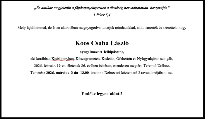 FőoldalKerületiElhunyt Koós Csaba László nyugalmazott lelkipásztor Elhunyt Koós Csaba László nyugalmazott lelkipásztor Életének 86. évében megtért Teremtő Urához a korábban több tiszántúli gyülekezetben is szolgálatot végző lelkész.