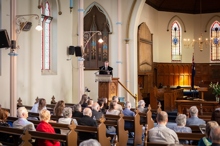 A helyi lelkipásztor üdvözlő szavai után Fekete Károly is köszöntötte a népes gyülekezetet, és átadta Nagy Sándor Csongor lelkipásztornak és Makkai Márta gondnok asszonynak azt az egységfát ábrázoló ezüst kitűzőt, amelyet a 2025-ben tartott Magyar Református Egységnapra érkezők kaptak ajándékba, hiszen a tavalyi Generális Konvent plenáris ülésén csatlakoztak a Magyar Református Egyház szervezetéhez az ausztráliai magyar reformátusok.