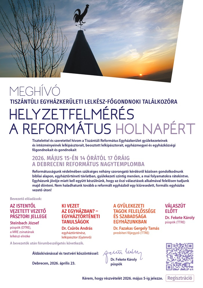 A Tiszántúli Református Egyházkerület elnöksége ezúttal az egyházkerület gyülekezeteinek és intézményeinek lelkipásztorait, beosztott lelkipásztorait, egyházmegyei és egyházközségi főgondnokait és gondnokait várja 2026. május 15-én a Debreceni Református Nagytemplomba. Az eseményre regisztrálni itt lehet!